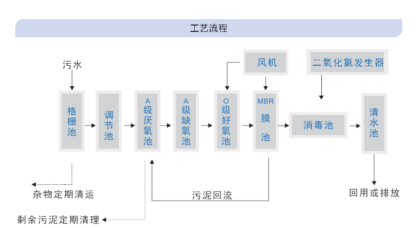 我公司采用成熟的“預處理-酸化水解-兩級接觸氧化-二氧化氯消毒"綜合處理的工藝。廢水通過沉砂、篩網過濾預處理后進入調節池,生化處理采用“酸化水解—好氧”,利用微生物多級新陳代謝來降解和去除廢水中的污染物。生化后的污水采用沉淀池進行泥水分離,上清液經強氧化劑消毒,達到殺菌的目的,使之達到排放標準。