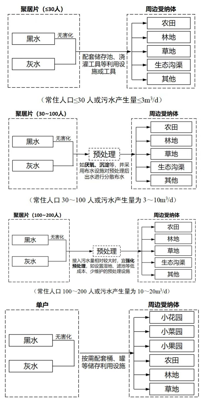 3、以村莊常住人口數、污水產生量將資源化利用分為零散戶和聚居片2類4種情況,細化了污水資源化利用各環節的要求。